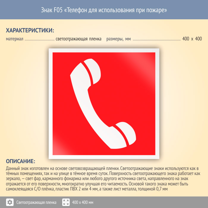 Знак F05 «Телефон для использования при пожаре (в том числе телефон прямой связи с пожарной охраной)» (светоотражающая пленка, 400х400 мм) в Сургуте купить
