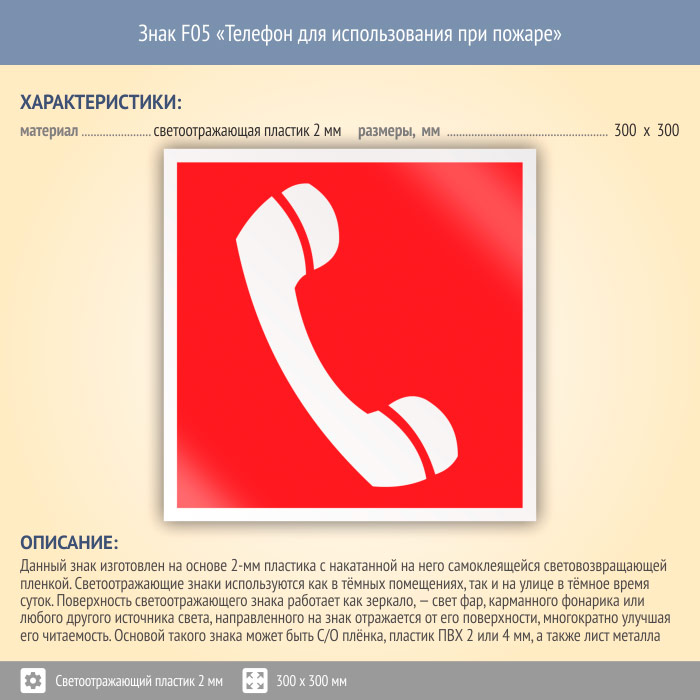 Знак F05 «Телефон для использования при пожаре (в том числе телефон прямой связи с пожарной охраной)» (светоотражающий пластик, 300х300 мм) в Сургуте купить