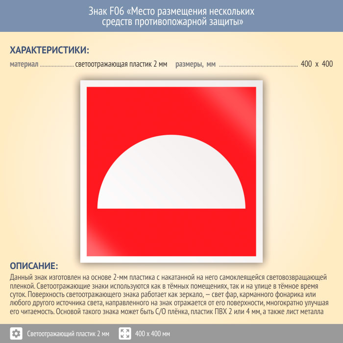 Знак F06 «Место размещения нескольких средств противопожарной защиты» (светоотражающий пластик, 400х400 мм) в Сургуте купить