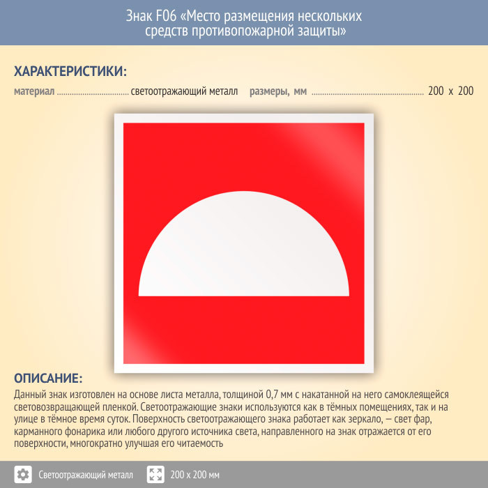 Знак F06 «Место размещения нескольких средств противопожарной защиты» (светоотражающий металл, 200х200 мм) в Сургуте купить