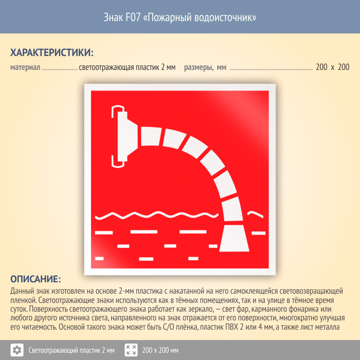 Знак F07 «Пожарный водоисточник» (светоотражающий пластик, 200х200 мм) в Сургуте купить