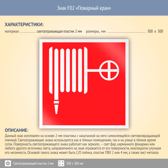 Знак F02 «Пожарный кран» (светоотражающий пластик, 300х300 мм) в Сургуте купить