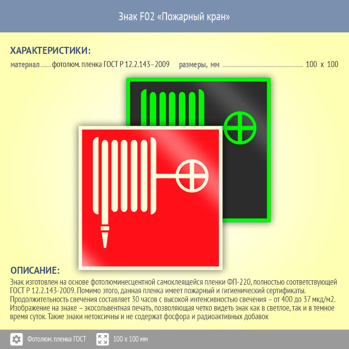 Знак F02 «Пожарный кран» (фотолюминесцентная пленка ГОСТ 34428-2018, 100х100 мм) в Сургуте купить