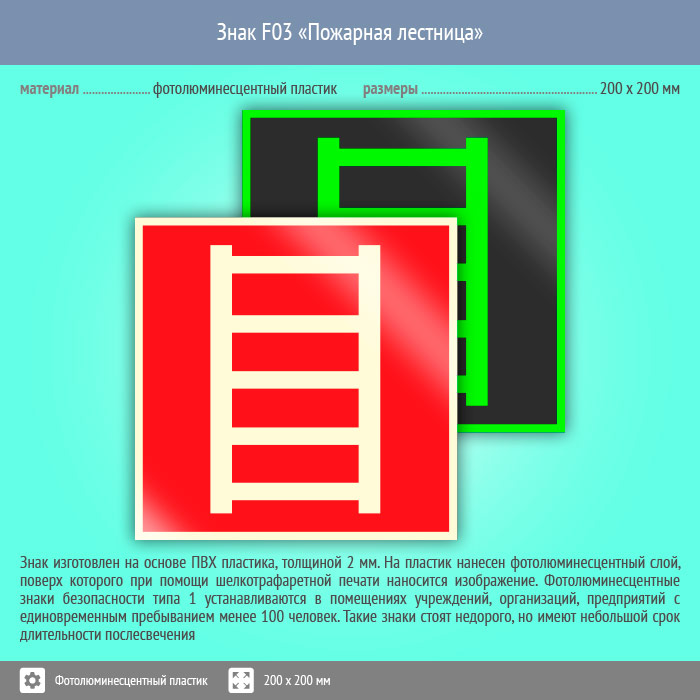Знак F03 «Пожарная лестница» (фотолюминесцентный пластик, 200х200 мм) в Сургуте купить