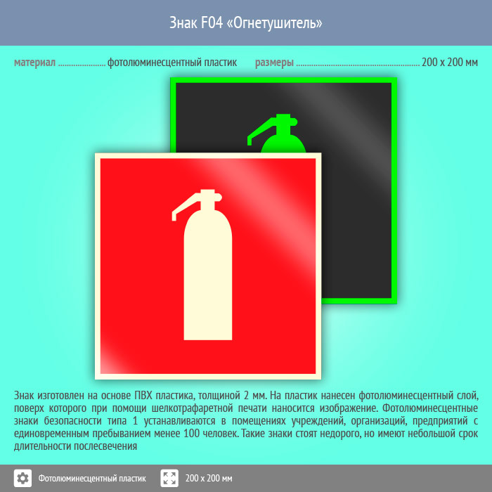 Знак F04 «Огнетушитель» (фотолюминесцентный пластик, 200х200 мм) в Сургуте купить