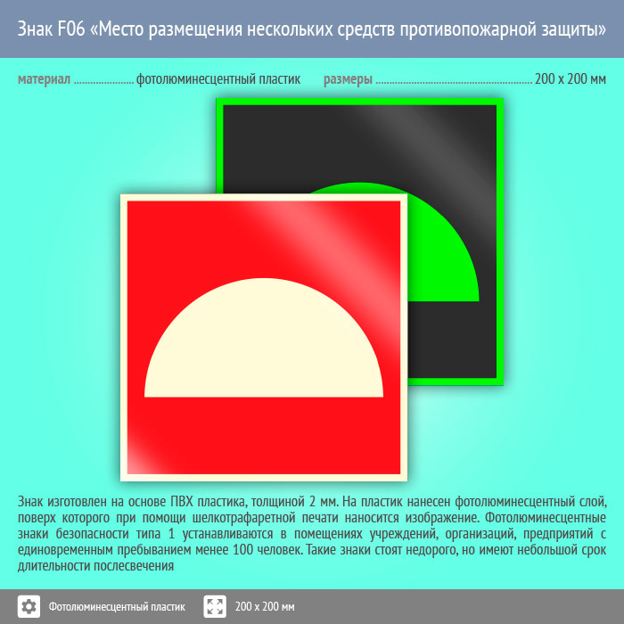 Знак F06 «Место размещения нескольких средств противопожарной защиты» (фотолюминесцентный пластик, 200х200 мм) в Сургуте купить