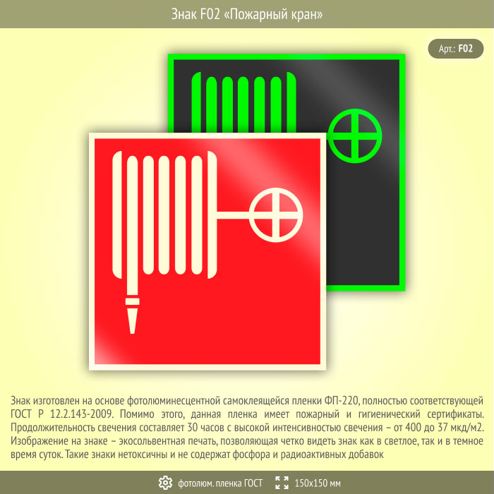 Знак F02 «Пожарный кран» (фотолюминесцентная пленка ГОСТ 34428-2018, 150х150 мм) в Сургуте купить