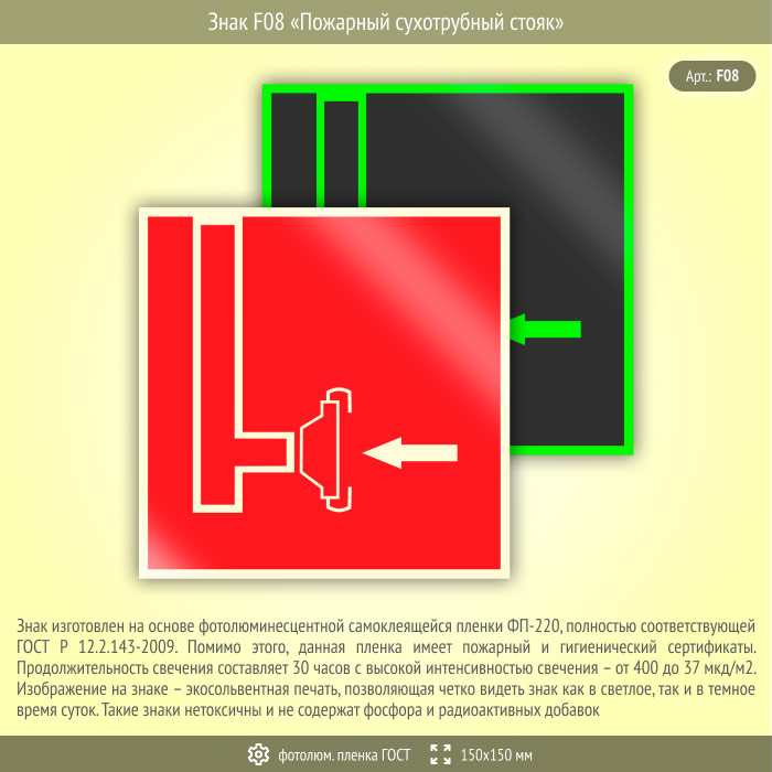 Знак F08 «Пожарный сухотрубный стояк» (фотолюминесцентная пленка ГОСТ 34428-2018, 150х150 мм) в Сургуте купить