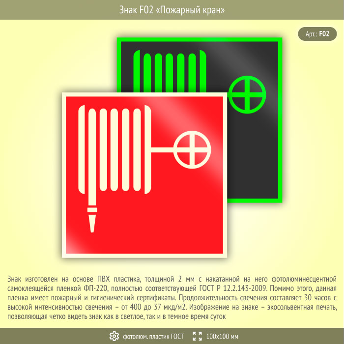 Знак F02 «Пожарный кран» (фотолюминесцентный пластик ГОСТ 34428-2018, 100х100 мм) в Сургуте купить