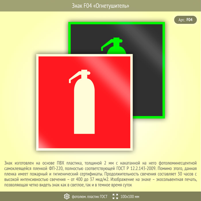 Знак F04 «Огнетушитель» (фотолюминесцентный пластик ГОСТ 34428-2018, 100х100 мм) в Сургуте купить