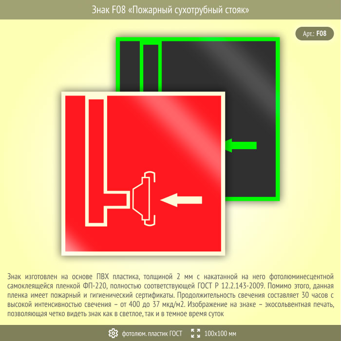 Знак F08 «Пожарный сухотрубный стояк» (фотолюминесцентный пластик ГОСТ 34428-2018, 100х100 мм) в Сургуте купить