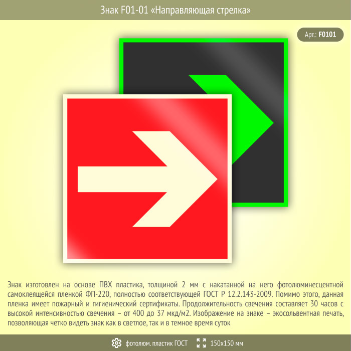 Знак F01-01 «Направляющая стрелка» (фотолюминесцентный пластик ГОСТ 34428-2018, 150х150 мм) в Сургуте купить