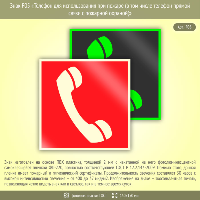 Знак F05 «Телефон для использования при пожаре (в том числе телефон прямой связи с пожарной охраной)» (фотолюминесцентный пластик ГОСТ 34428-2018, 150х150 мм) в Сургуте купить