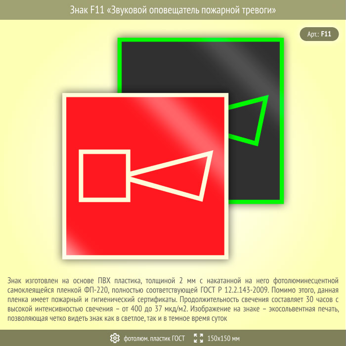Знак F11 «Звуковой оповещатель пожарной тревоги» (фотолюминесцентный пластик ГОСТ 34428-2018, 150х150 мм) в Сургуте купить