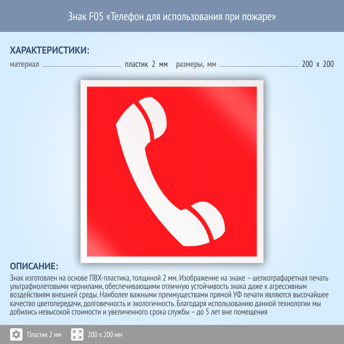 Знак F05 «Телефон для использования при пожаре (в том числе телефон прямой связи с пожарной охраной)» (пластик, 200х200 мм) в Сургуте купить