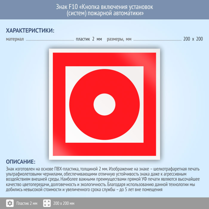 Знак F10 «Кнопка включения установок (систем) пожарной автоматики» (пластик, 200х200 мм) в Сургуте купить