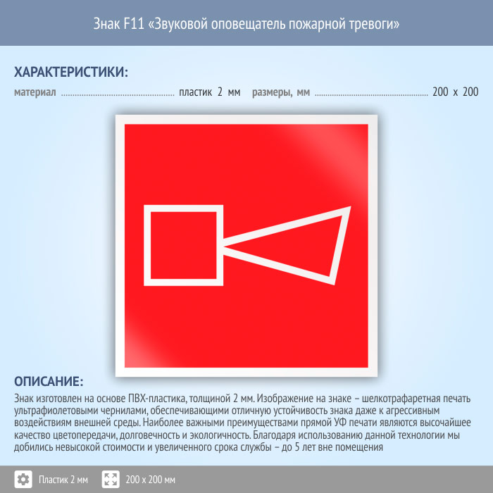 Знак F11 «Звуковой оповещатель пожарной тревоги» (пластик, 200х200 мм) в Сургуте купить