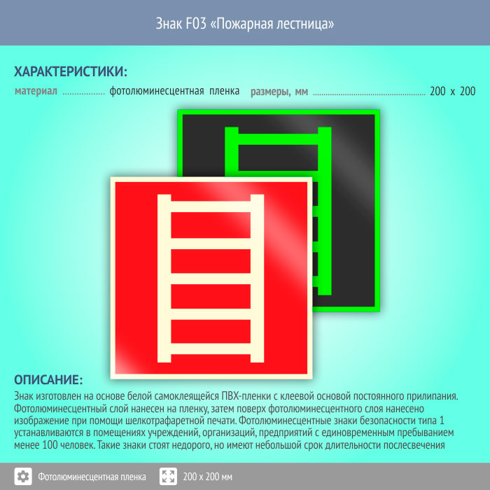 Знак F03 «Пожарная лестница» (фотолюминесцентная пленка, 200х200 мм) в Сургуте купить