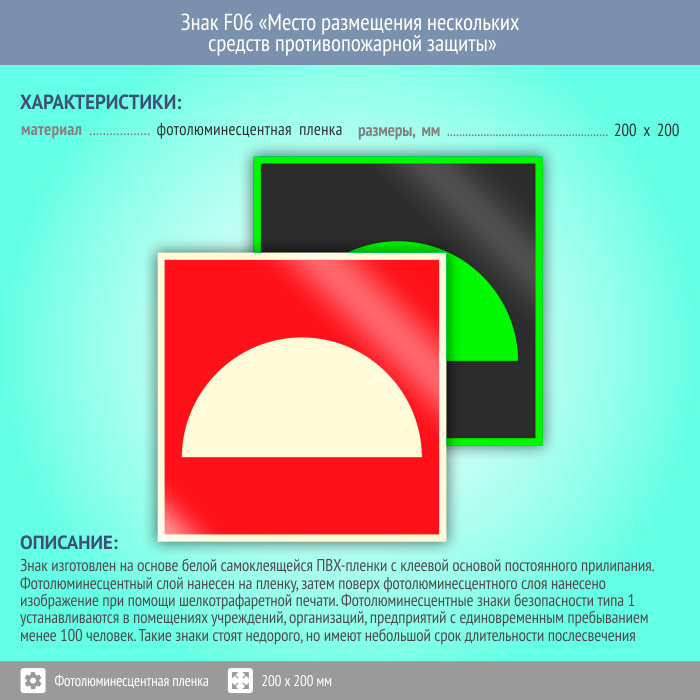 Знак F06 «Место размещения нескольких средств противопожарной защиты» (фотолюминесцентная пленка, 200х200 мм) в Сургуте купить