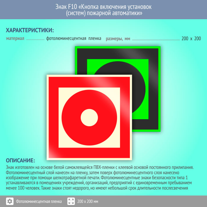 Знак F10 «Кнопка включения установок (систем) пожарной автоматики» (фотолюминесцентная пленка, 200х200 мм) в Сургуте купить