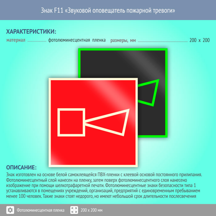 Знак F11 «Звуковой оповещатель пожарной тревоги» (фотолюминесцентная пленка, 200х200 мм) в Сургуте купить