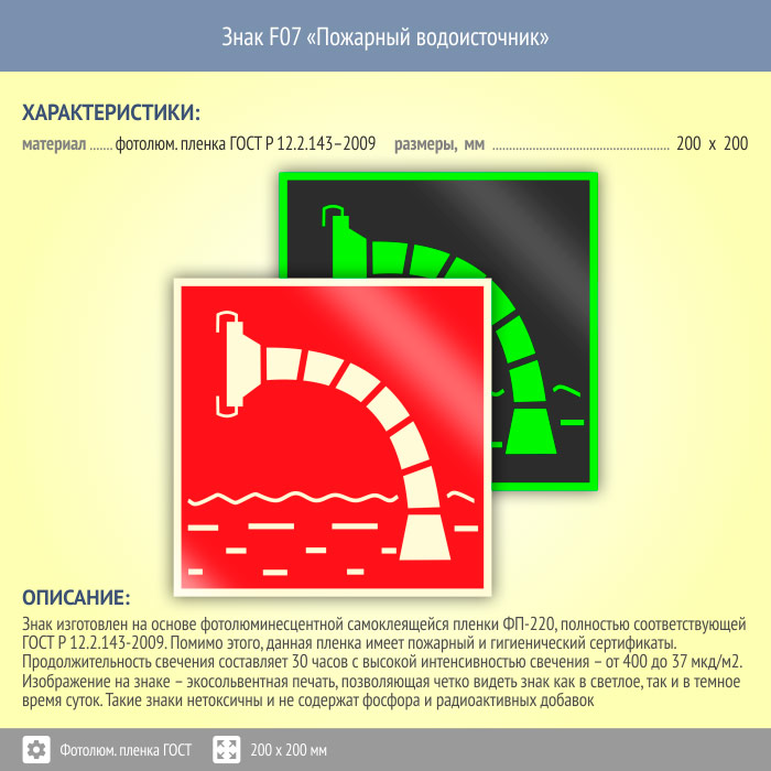 Знак F07 «Пожарный водоисточник» (фотолюминесцентная пленка ГОСТ 34428-2018, 200х200 мм) в Сургуте купить