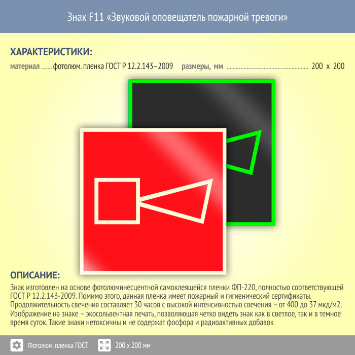 Знак F11 «Звуковой оповещатель пожарной тревоги» (фотолюминесцентная пленка ГОСТ 34428-2018, 200х200 мм) в Сургуте купить