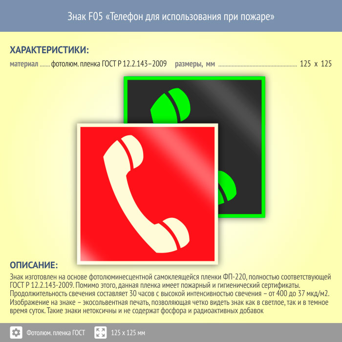 Знак F05 «Телефон для использования при пожаре (в том числе телефон прямой связи с пожарной охраной)» (фотолюминесцентная пленка ГОСТ 34428-2018, 125х125 мм) в Сургуте купить