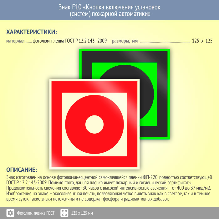 Знак F10 «Кнопка включения установок (систем) пожарной автоматики» (фотолюминесцентная пленка ГОСТ 34428-2018, 125х125 мм) в Сургуте купить