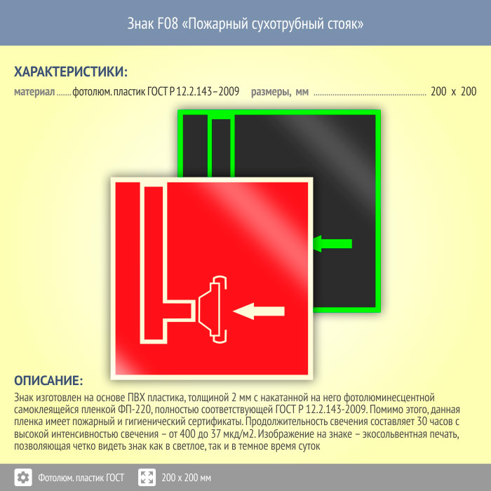 Знак F08 «Пожарный сухотрубный стояк» (фотолюминесцентный пластик ГОСТ 34428-2018, 200х200 мм) в Сургуте купить