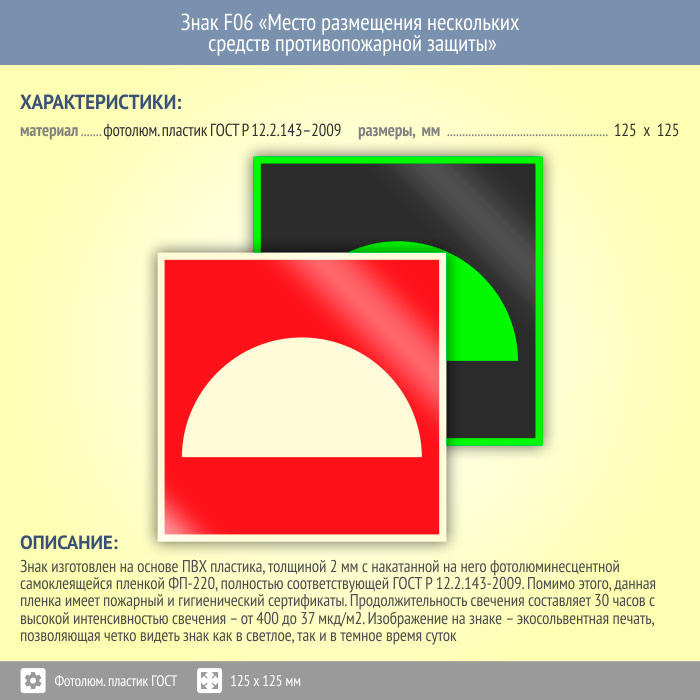Знак F06 «Место размещения нескольких средств противопожарной защиты» (фотолюминесцентный пластик ГОСТ 34428-2018, 125х125 мм) в Сургуте купить