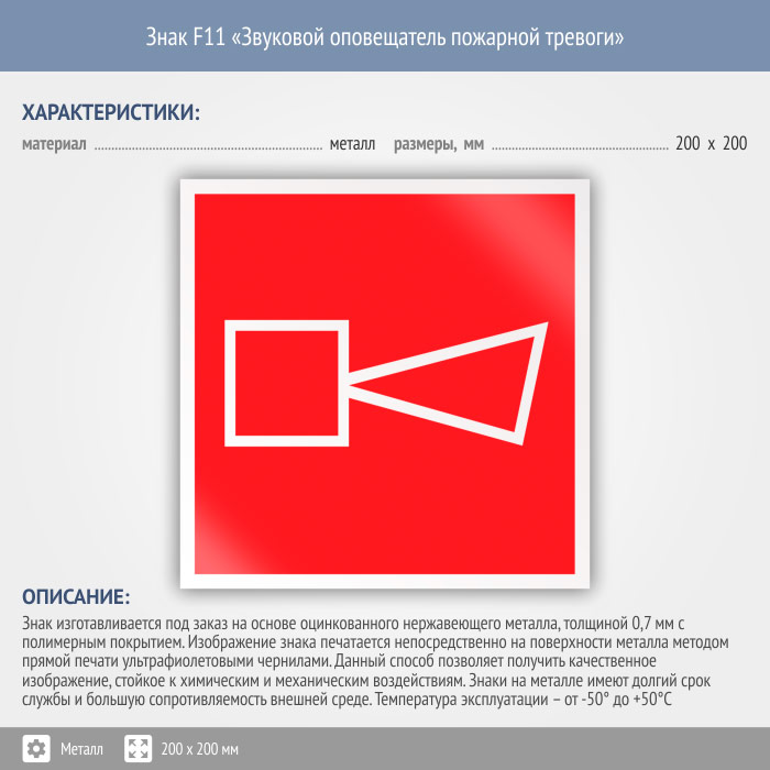Знак F11 «Звуковой оповещатель пожарной тревоги» (металл, 200х200 мм) в Сургуте купить