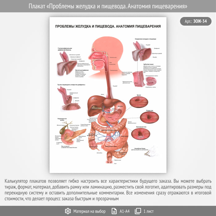 Плакат «Проблемы желудка и пищевода. Анатомия пищеварения» (ЗОЖ-34, 1 лист) в Сургуте купить